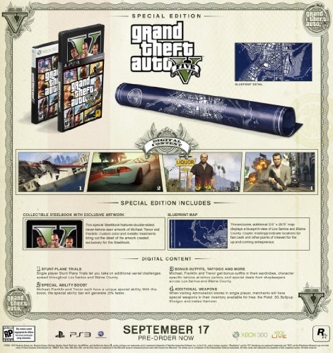 - L''édition spéciale de Grand Theft Auto V comprend : Le jeu GTA 5 dans son steelbook collector exclusif Une carte exclusive du monde de GTA 5 de 55x68 cm proposant une vue détaillée de Los Santos et Blaine County et des lieux importants du jeu Du contenu digital exclusif : - Des défis de voltige aérienne supplémentaires - Un boost de compétence spéciale augmentant de 25% la vitesse de remplissage de la barre de compétence des trois héros du jeu - 3 tenues supplémentaires, des tatouages spécifiques et des remises dans toutes les boutiques du jeu - 4 armes supplémentaires disponibles gratuitement chez Ammunation, le Pistolet Cal.50, le Fusil Bullpup et le Marteau Grand Theft Auto V Los Santos : une métropole tentaculaire et ensoleillée, pleine de gourous, de starlettes et célébrités décolorées, à une époque considérée comme l'eldorado du monde occidental et qui lutte aujourd'hui pour rester à flot dans une ère d'incertitude économique et de télé-réalité pas cher. Au milieu de la tourmente, trois criminels très différents tracent leur propre route : Franklin, un débrouillard de la rue à la recherche de réelles opportunités et d'argent facile, Michael, un ex-arnaqueur professionnel dont la retraite est beaucoup moins rose que ce qu'il espérait et Trevor, un maniaque violent dirigé par le hasard en attendant un gros coup. À court d'options, l'équipe risque le tout pour le tout dans une série de braquages?audacieux et dangereux qui pourraient les mettre au vert. Grand Theft Auto V est le plus grand, le plus dynamique et le plus diversifié monde ouvert jamais créé, alliant la narration et un gameplay novateur où les joueurs peuvent sauter d'un personnage à l'autre, en jouant toutes les facettes de l'histoire entrelacée du jeu.