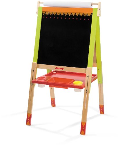 Description : Tableau 4 pieds ré,glables - Janod Deux faces : 1 cô,té, ardoise pour la craie, 1 cô,té, magné,tique pour le feutre effaç,able Livré, avec rouleau de papier, 6 magnets, 10 craies, 1 brosse pour effacer, 1 feutre) A partir de : 3 ans Dimensions : 55 x 10 x 130 cm Hauteur ré,glable de 91 à, 126 cm